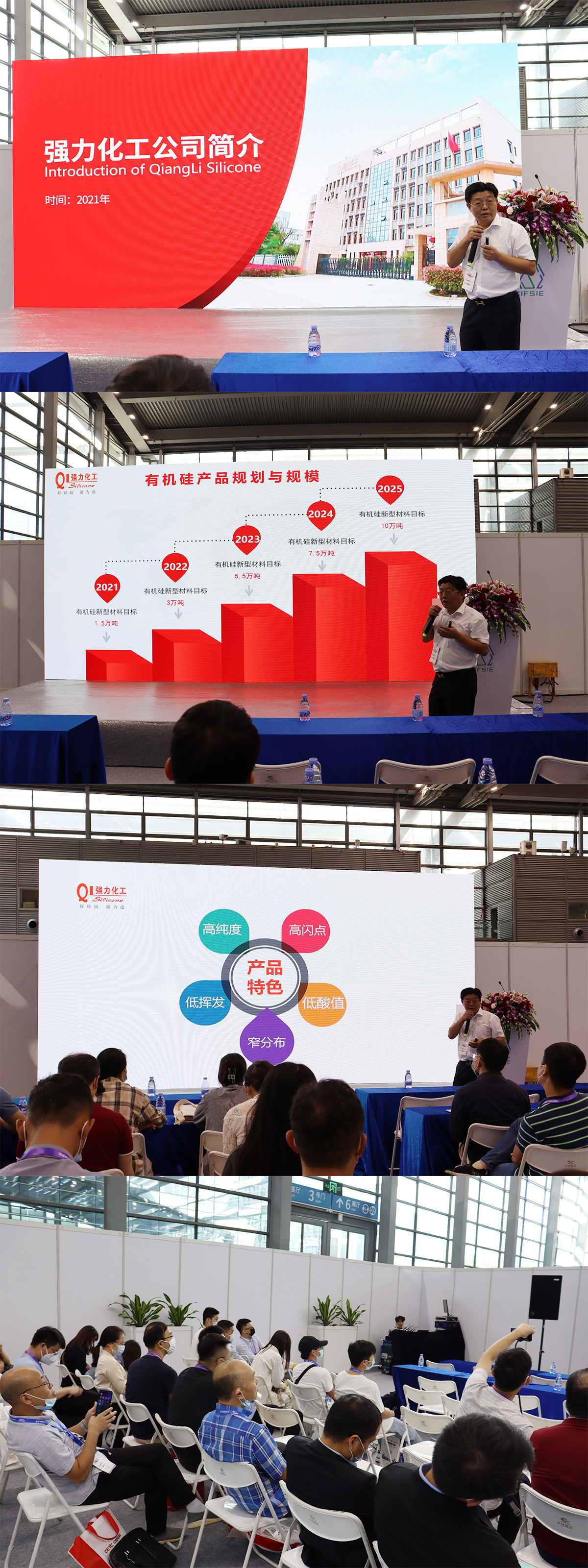 强力化工董事长叶光华发表重要演讲,讲述了当今有机硅行业的现状并对前景的展望,同时也分享我司高端产品高纯度硅油制作工艺,全场干活满满,座无虚席。