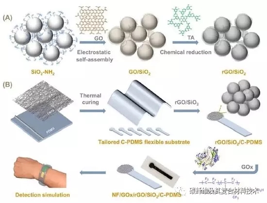 此外,它还可以引入更多的二次传感材料,从而增强其多功能化能力。使用沉积在碳纳米管(CNT)和PDMS复合基底上的rGO涂层二氧化硅(SiO2)纳米球、葡萄糖氧化物和Nafion溶液检测汗液中的葡萄糖。化学电阻气体传感器由rGO和氧化锌(ZnO)纳米棒制成。